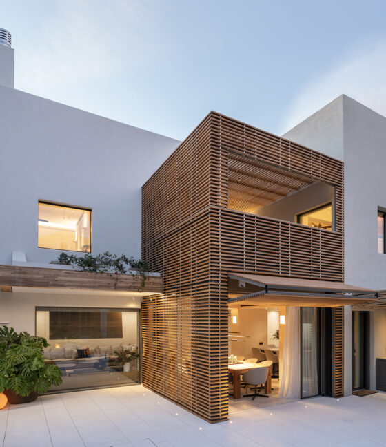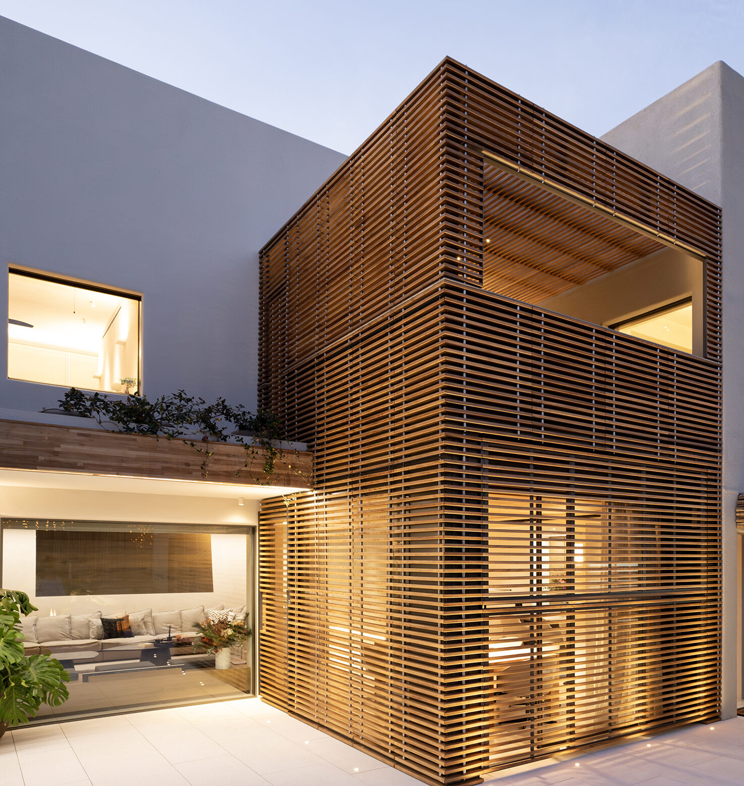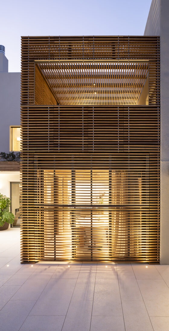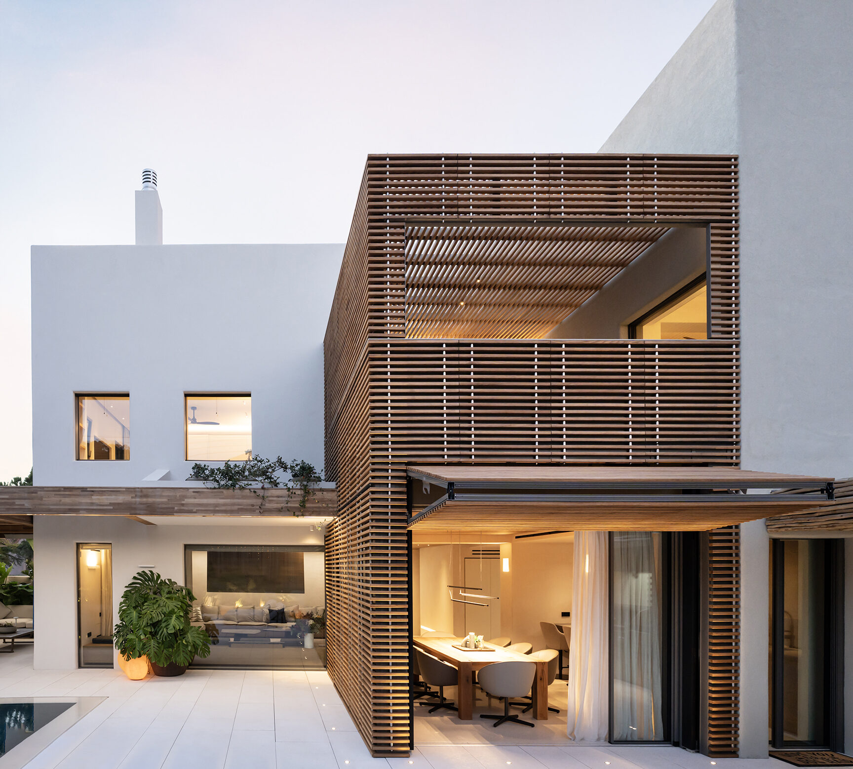Δημιουργήθηκε ένας ξύλινος κλωβός από ξυλεία Ιρόκο, ο οποίος αναπτύσσεται σε δύο επίπεδα, ενισχύοντας τον διάλογο μεταξύ εσωτερικού και εξωτερικού χώρου. Ο κάτω όροφος φιλοξενεί την τραπεζαρία της οικίας, ενώ ο άνω όροφος λειτουργεί ως βεράντα-καθιστικό. Ο κλωβός συντίθεται από οριζόντιες δοκίδες Ιρόκο ίδιων διατομών, τοποθετημένες σε σταθερές αποστάσεις μεταξύ τους. Στο άνω επίπεδο, η κατασκευή παραμένει πλήρως διαπερατή, προσφέροντας ανεμπόδιστη θέα και φυσικό αερισμό. Στο κάτω επίπεδο, η διαφάνεια ρυθμίζεται μέσω υαλοστασίων, τα οποία μπορούν να ανοίξουν, ενώ η ενσωμάτωση του αναδιπλούμενου συστήματος σκίασης HF-30 επιτρέπει την προσαρμογή της όψης του κλωβού ανάλογα με τις εκάστοτε συνθήκες. Αυτή η προσέγγιση ενισχύει τη συνέχεια μεταξύ του εσωτερικού και του εξωτερικού χώρου, προάγοντας μια βιωματική εμπειρία διαβίωσης που ισορροπεί ανάμεσα στη διαφάνεια και την προστασία, στην διαπερατότητα και την ιδιωτικότητα. Την αρχιτεκτονική μελέτη ανέλαβε το γραφείο Nikos Adrianopoulos.